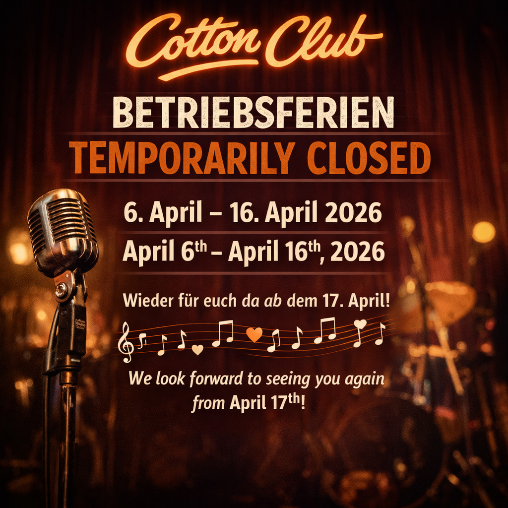 Wir bedauern diese kurzfristige Pause sehr und danken euch herzlich für euer Verständnis und eure Treue. Gleichzeitig freuen wir uns umso mehr darauf, euch ab dem 17. April wieder wie gewohnt mit großartiger Live-Musik im Cotton Club begrüßen zu dürfen!